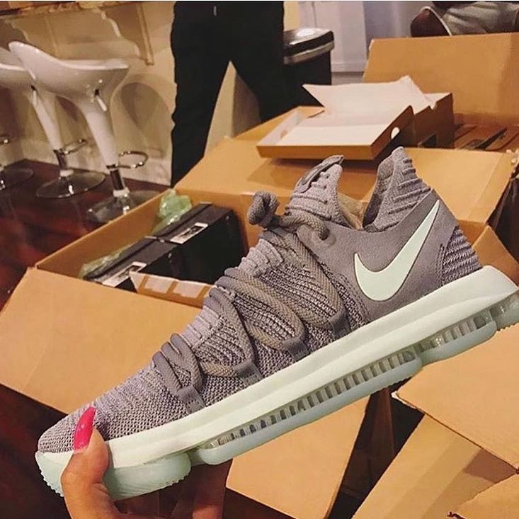 眼前这双Nike KD 10“Cool Grey”由@sneakerreporter曝光在其个人IG上。图中可以看到此款KD 10由酷灰/白色调组成,酷灰的鞋面点缀白色swoosh,并选择了白色中底搭配乳白色水晶底。