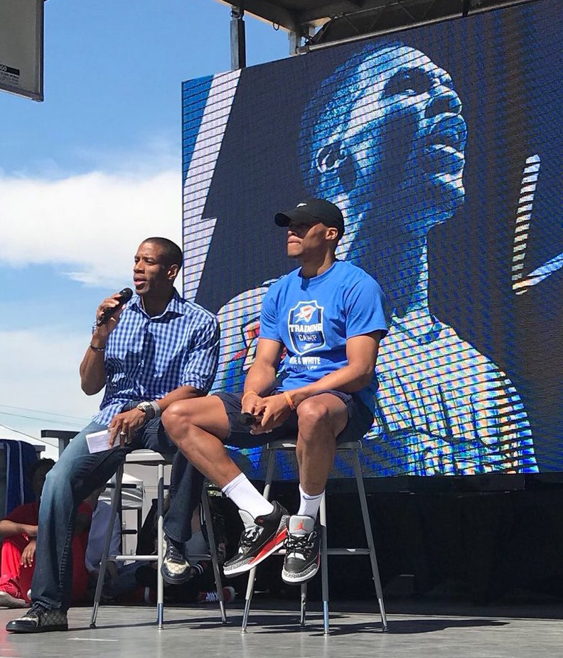 Russell Westbrook在庆祝他以五年2.05亿美元续约留在Okahoma的活动上,被拍到上脚了一款全新的“OKC”Air Jordan 3 PE。