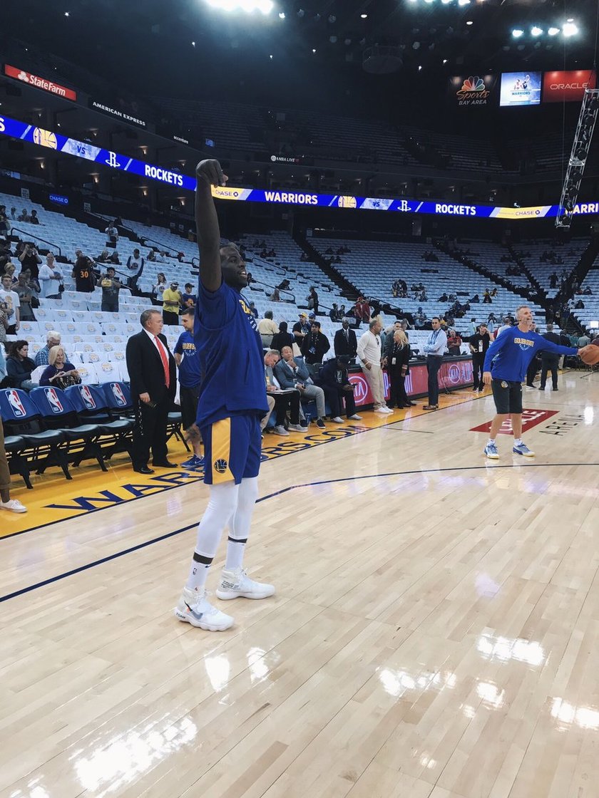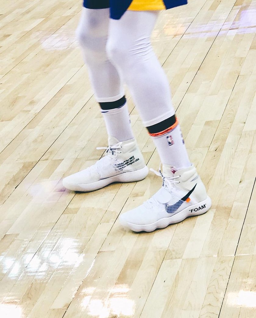 勇士球员德拉蒙德·格林在赛前训练中上脚了OFF WHITE x Nike React Hyperdunk 2017。鞋款将在11月份正式发售。