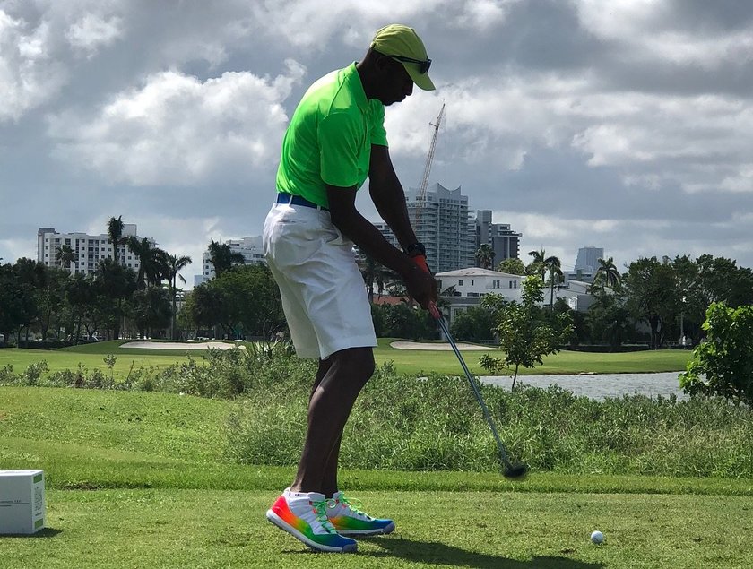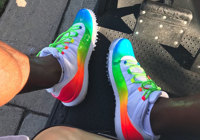 “退休”后的君子雷正享受着高尔夫球带来的乐趣。这回吸引我们目光的是他在高尔夫球场上所穿的这款Air Jordan 11 Low。彩虹渐变色的配色设计如同雷·阿伦的生活一般丰富多彩。