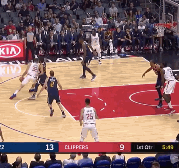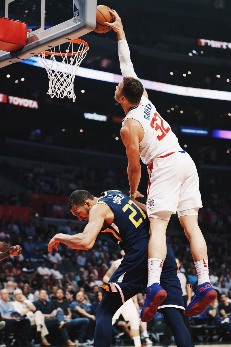 在今日快船对阵爵士的比赛中,格里芬在第一节的一次进攻中突破卢比奥的防守,在前来协防的戈贝尔头上完成了一记单手战斧劈扣。