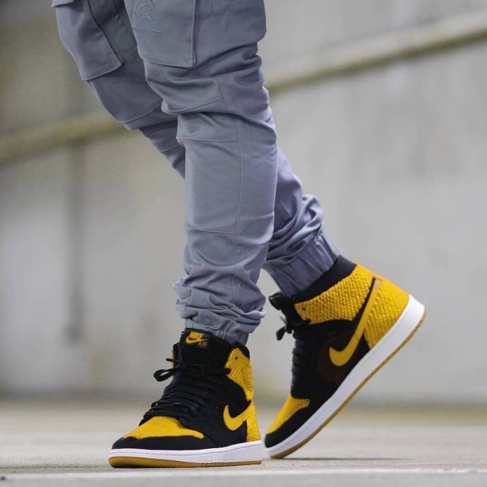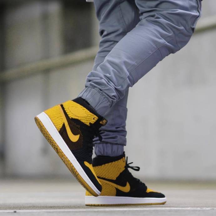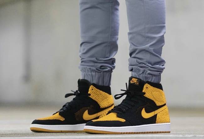 继多个配色的Air Jordan 1 Flyknit释出后,今天我们又看到了黑黄装扮呈现在该鞋款上。