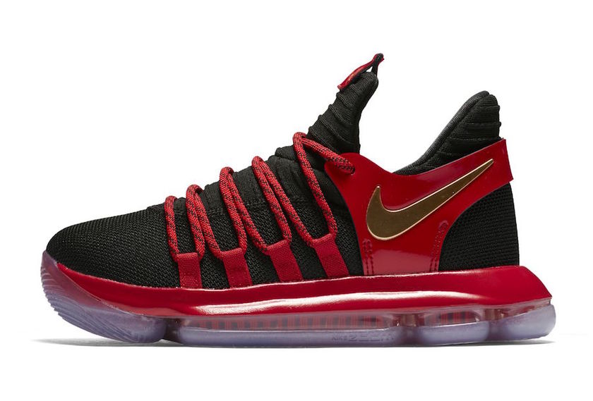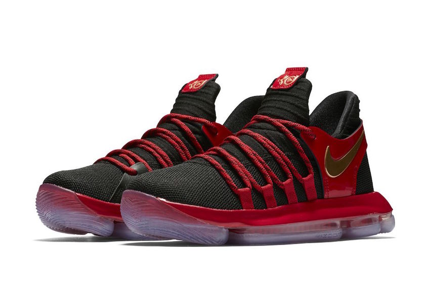 Nike将会在近期发售一款全新配色的Nike KD 10。新鞋款将采用黑红配色打造,并且用金色元素加以渲染。据悉该鞋款仅为GS独享。