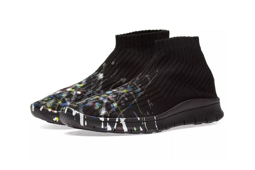 Maison Margiela 此番又将招牌“泼墨”元素注入袜式鞋款 Sockrunner 之中。设计上采用类似黑色长筒棉袜的条纹面料制作鞋面,虽然轮廓与 Balenciaga 红极一时的 Speed Trainer 颇为相似,但鞋头位置的彩色泼墨细节则凸显了 Maison Margiela 的艺术性,最后搭载复古 Gommus大底而成。目前该鞋款已可经由 END. 购得,定价为 $690 美元。