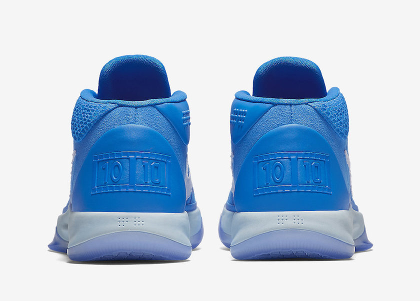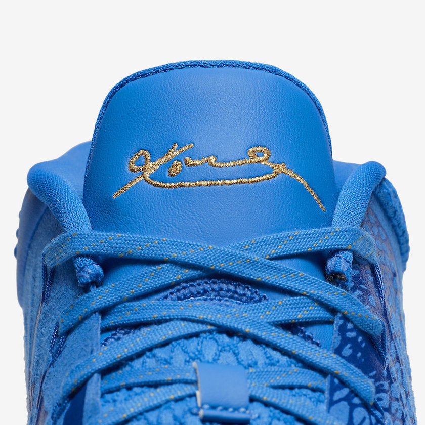 这款 PE 配色以清爽的蓝色为基调,鞋身布满象征黑曼巴的蛇纹细节。而白色的帆布 Nike Swoosh 出现在侧面,与鞋身呈现出两种不同质感。后跟以科比美国队的10号以及德罗赞的球衣10号组成“10/10”的标志,鞋垫更是以照片双拼的设计呈现,寓意曼巴精神的传承。