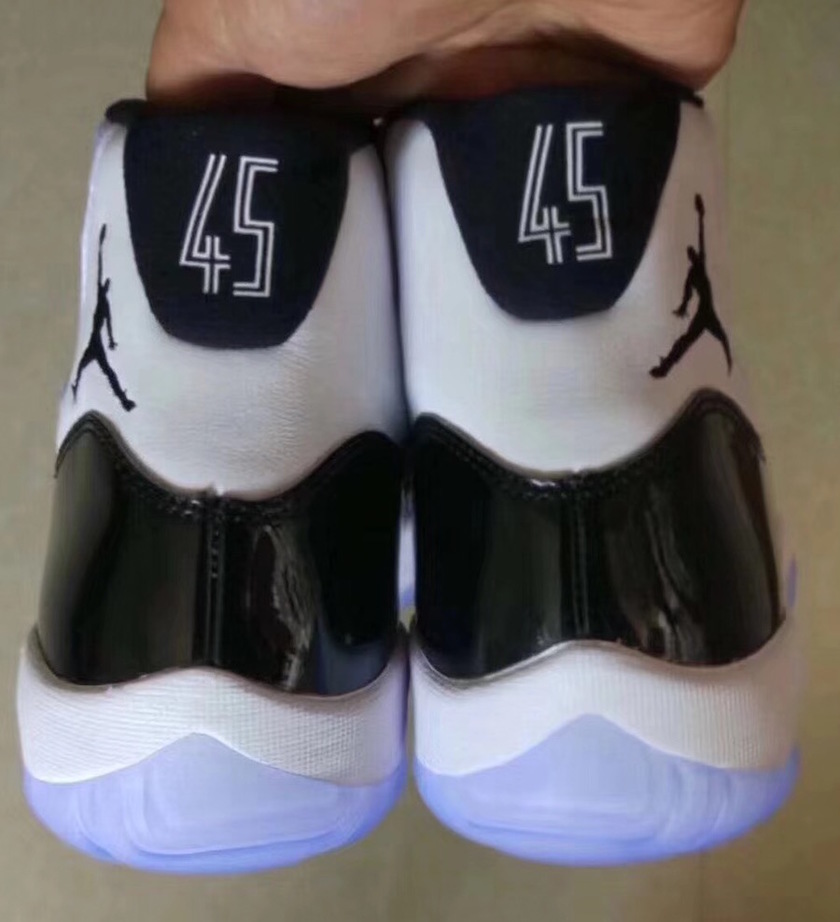 虽然这款 Air Jordan 11 依旧采用经典的黑白 “Concord” 配色,但近期常用的硕大漆皮依旧没有任何变化。后跟部位除了“45”号细节之外,其外侧 Jumpman Logo 也回归元年设计,整体外观设计与 2016 大灌篮一致。虽然不理解 Jordan Brand 为什么一直要使用市场并不待见的大漆皮设计,但相信这种元年 OG 外观的11代依旧还是会吸引不少死忠粉的喜爱吧。
