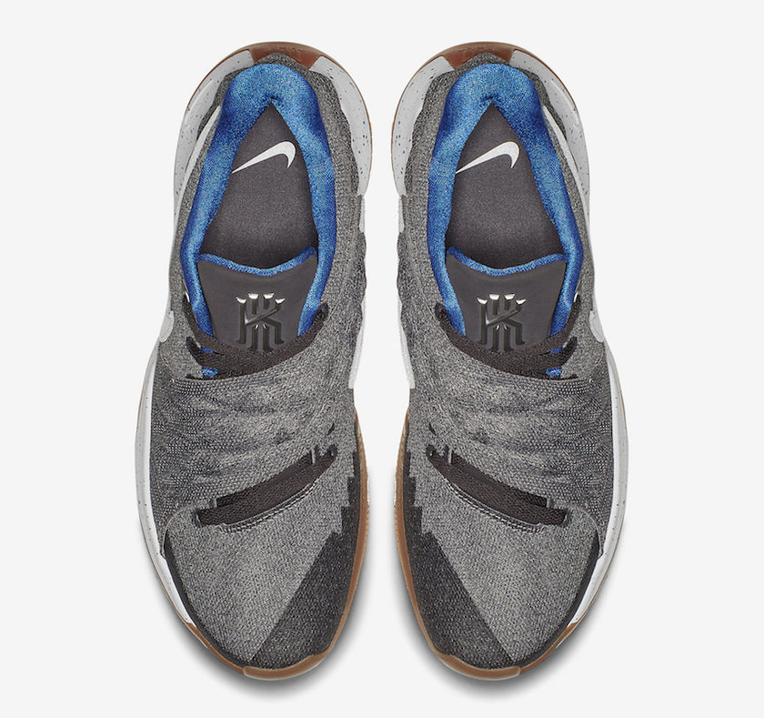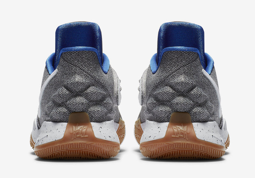 鞋舌等部分鞋面细节处以深灰色调,而贴图式白色的 Nike Swoosh 更是极为显眼。搭配宝蓝色的内衬、泼墨式白色中底、以及生胶大底,这款 Nike Kyrie Low 设计元素颇为复杂,却完全无任何违和感。