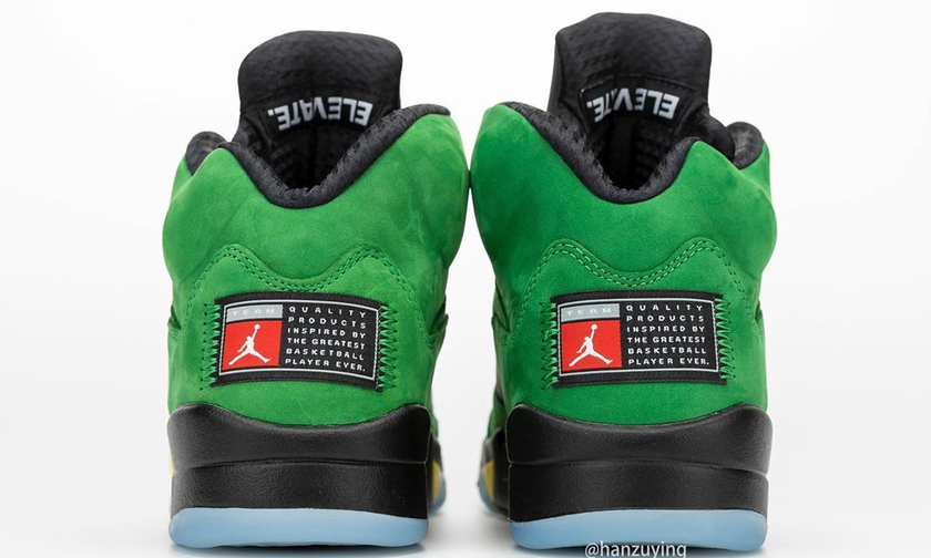 市售版 Air Jordan 5“Oregon”整体酷似 PE 版本,以绿色及鹅黄色主打。最大的区别在于鞋舌与鞋后跟处的俄勒冈鸭队 logo 以及鸭子图案被 Jumpman logo 和标签取代了。但整双鞋的气质与颜值却没有受损,相信还是会得到不少人青睐。