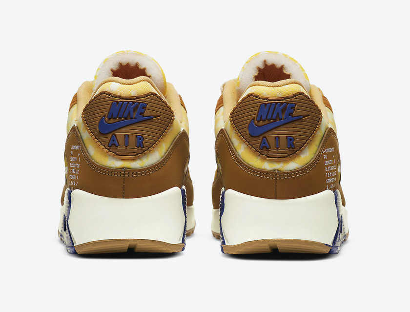 这款配色名为 Nike Air Max 90 SE “Chutney”,灵感源于 Chutney 酸辣酱,整双鞋也采用酸辣酱式配色演绎。深棕色主打,搭配蓝色细节,以及鞋领处的黄白酱色调花纹,点明设计主题。