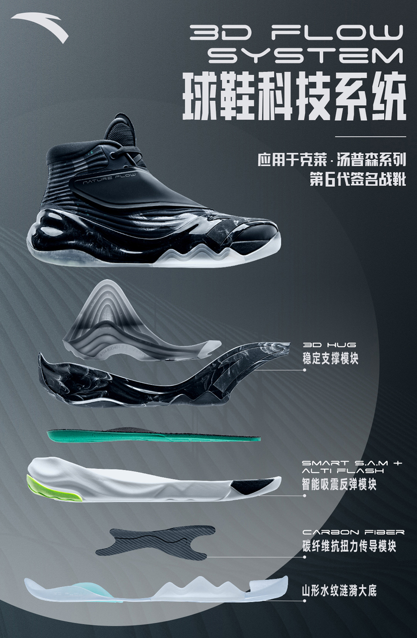 鞋身依旧保持了汤普森喜欢的魔术贴绑带设计,因此上脚后的包裹感相当不错。鞋款首次加入了超大面积的碳板,向前后掌都有延伸,因此抗扭转的保护相当出众。而整个缓震系统则更为惊艳,在后跟加入SMART S.A.M 智能吸震科技,兼顾软弹脚感和后掌支撑。中底则是ALTI FLASH缓震材质,有着高达70%的回弹率。