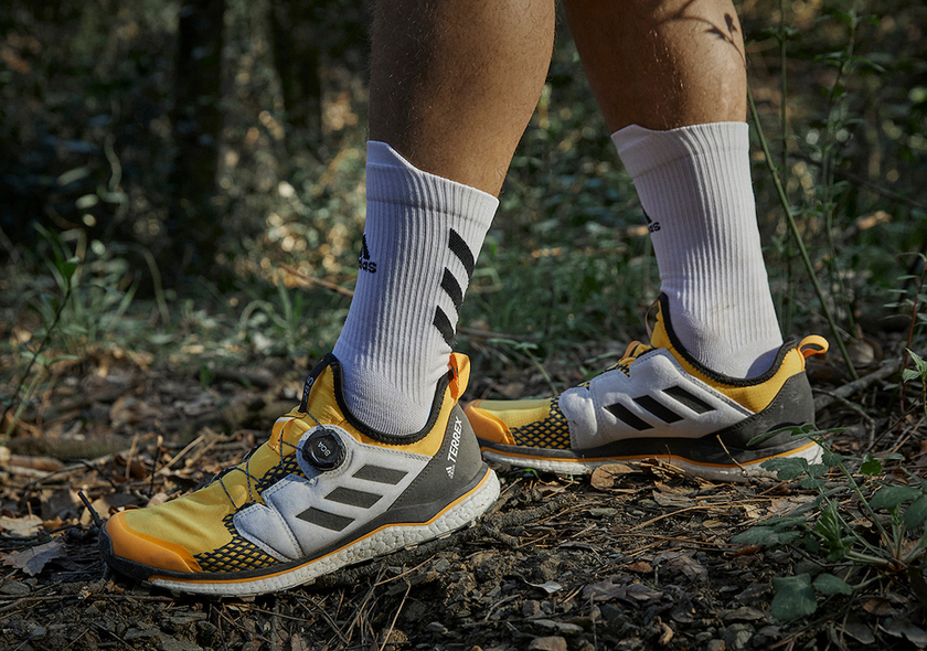 而鞋款本身的门道则更丰富,将GORE-TEX防水设计和SENSIFIT贴合技术在鞋面上做了完美融合,因为是朝向户外跑鞋设计的方向所以这样的技术结合几乎塑造的无懈可击的包裹感,为了提升这种体验在鞋带也是最简约的抽拉的绳索式设计。鞋面专门去做包覆设计,集防水、支撑和包裹感于一身。