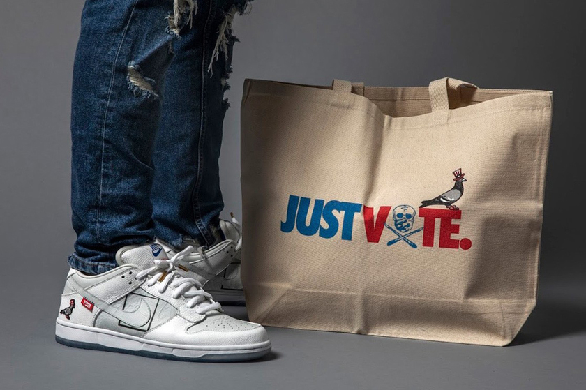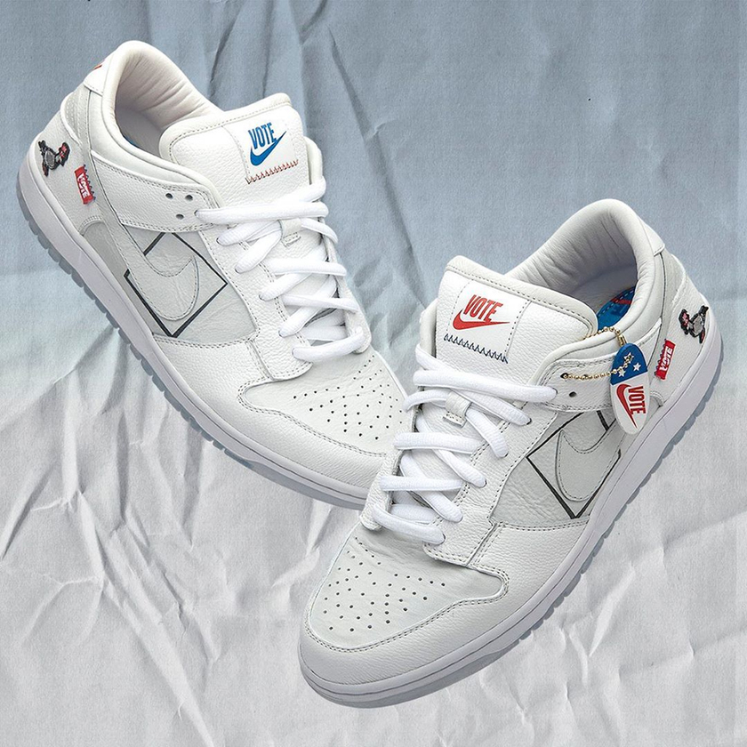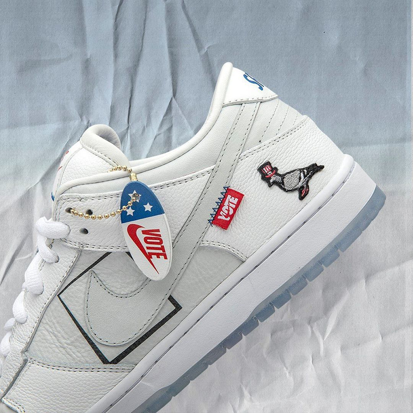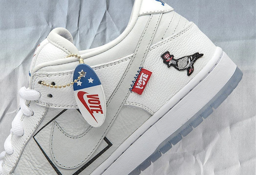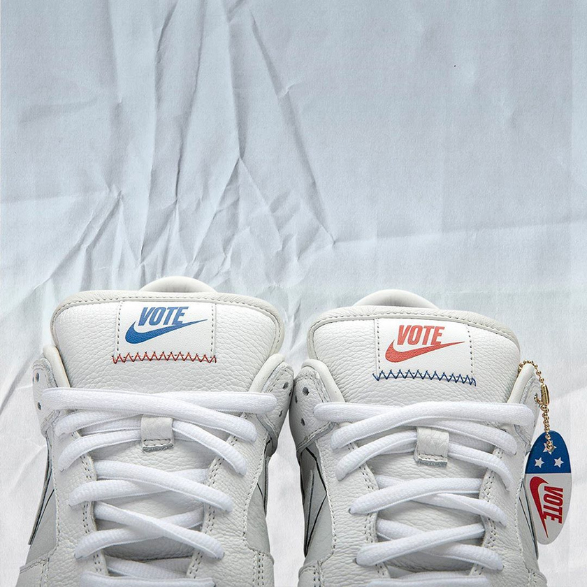 整双鞋也采用白色为基底搭配红蓝色调呈现。细节部分,鞋舌上的 VOTE 标签,Swoosh 处的 VOTE 标签以及头顶礼帽的鸽子刺绣,彰显美国大选主题,鼓励民众行使投票权利。