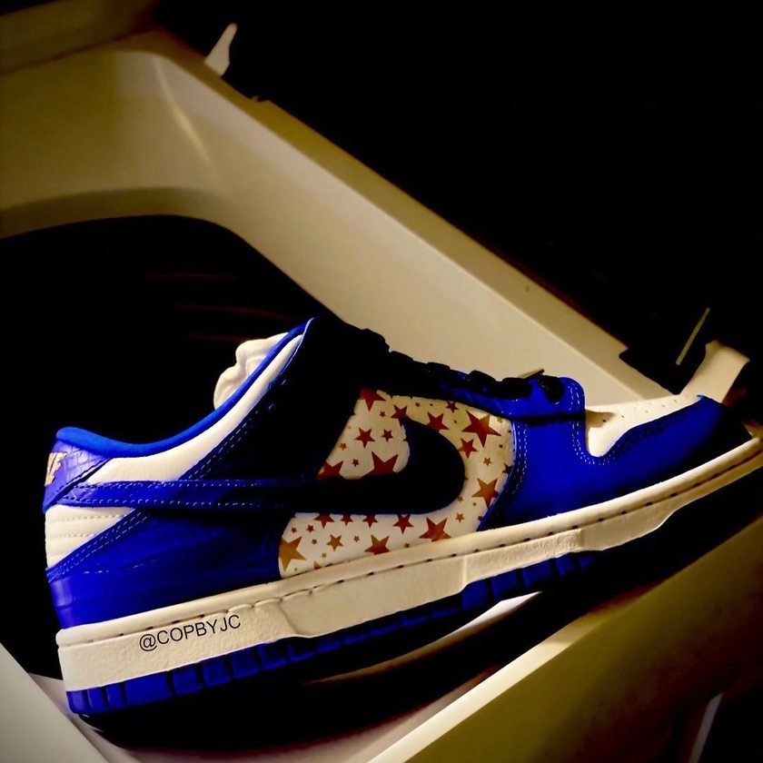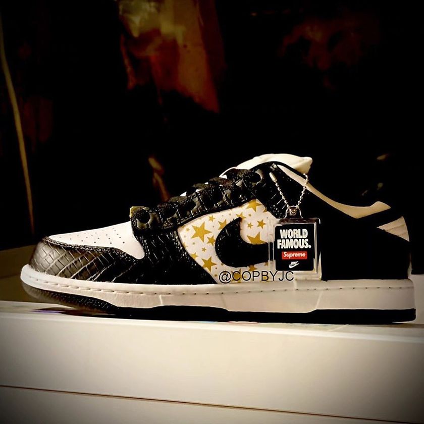 而后来双方发售的 Dunk High 设计鞋侧呈现的是星星元素,则是因为 Supreme 创始人 James Jebbia 很不喜欢最初版满印 Nike swoosh 。