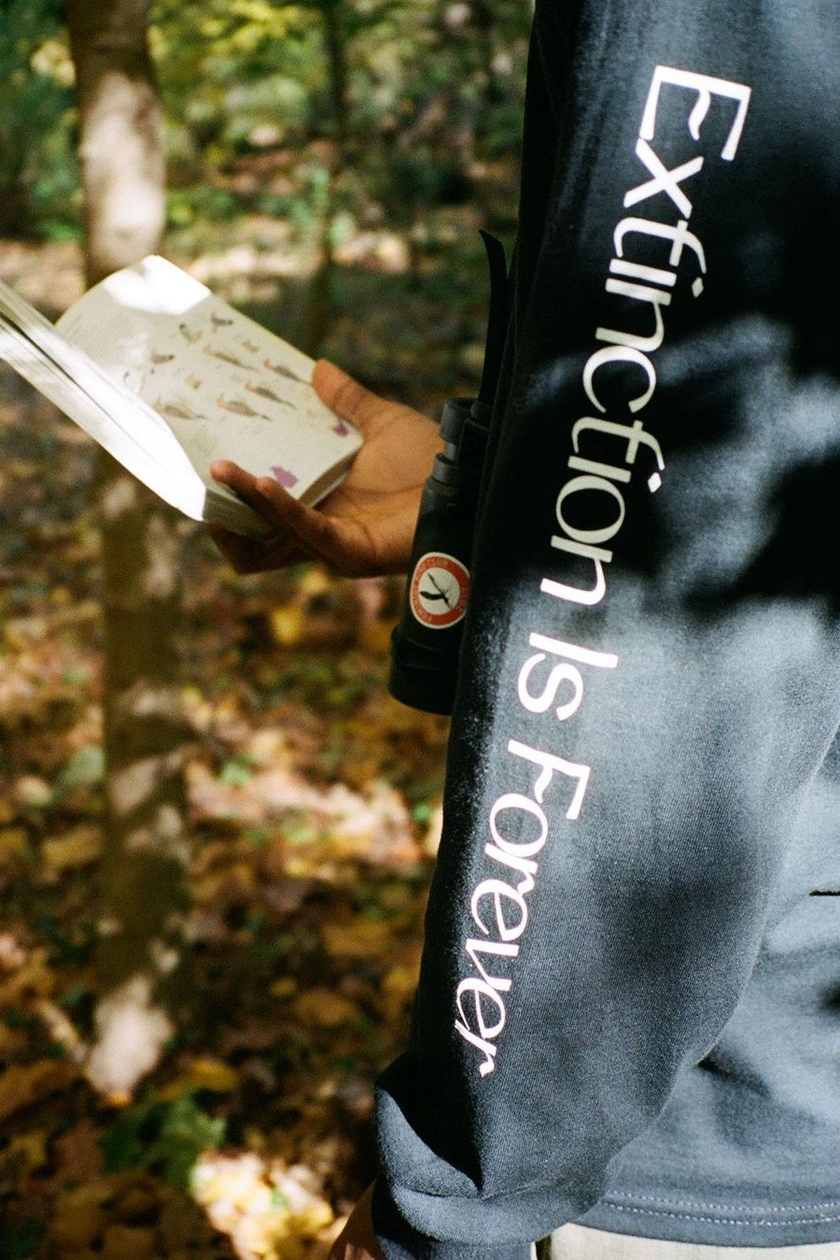 单品包括长、短袖 T 恤,在设计上以野生鸟类画像作为主打,缀以“Extinction is Forever”字样标语,点明公益主题。