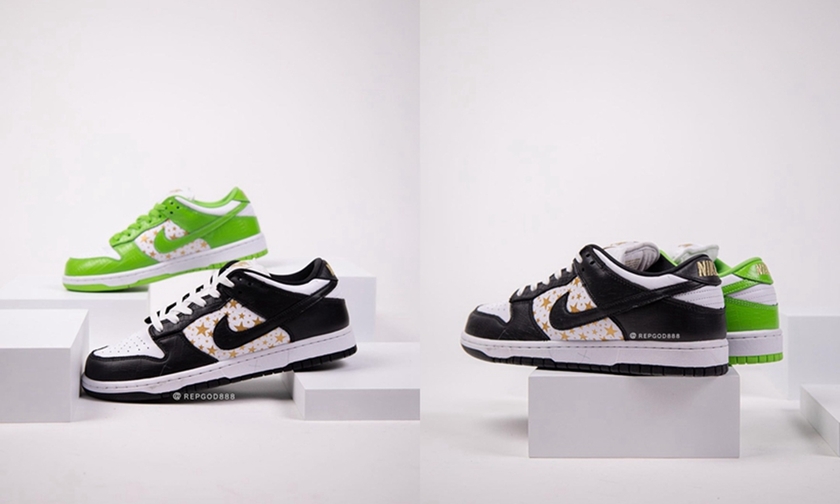 这两款配色分别以黑色、荧光绿色搭配白色基底示人,鳄鱼纹理皮革与经典五角星图案点缀,尽显奢华高规格。 Supreme 则出现于鞋垫处,与后跟处金色 Nike 刺绣一同,彰显联名身份。