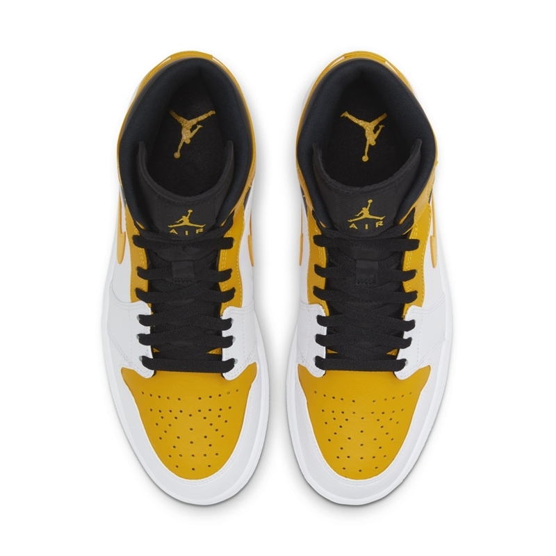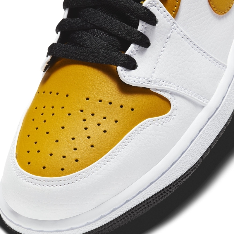 这款 AJ 1 Mid 鞋面采用黄色与白色皮革拼接呈现,鞋头构色为黄色在内白色作为框架,虽然组成与 AJ 1 “新秀”出入很大,但仍给人一种新秀的气质。鞋帮上黑色细节点缀,则熟悉的味道更浓郁了。