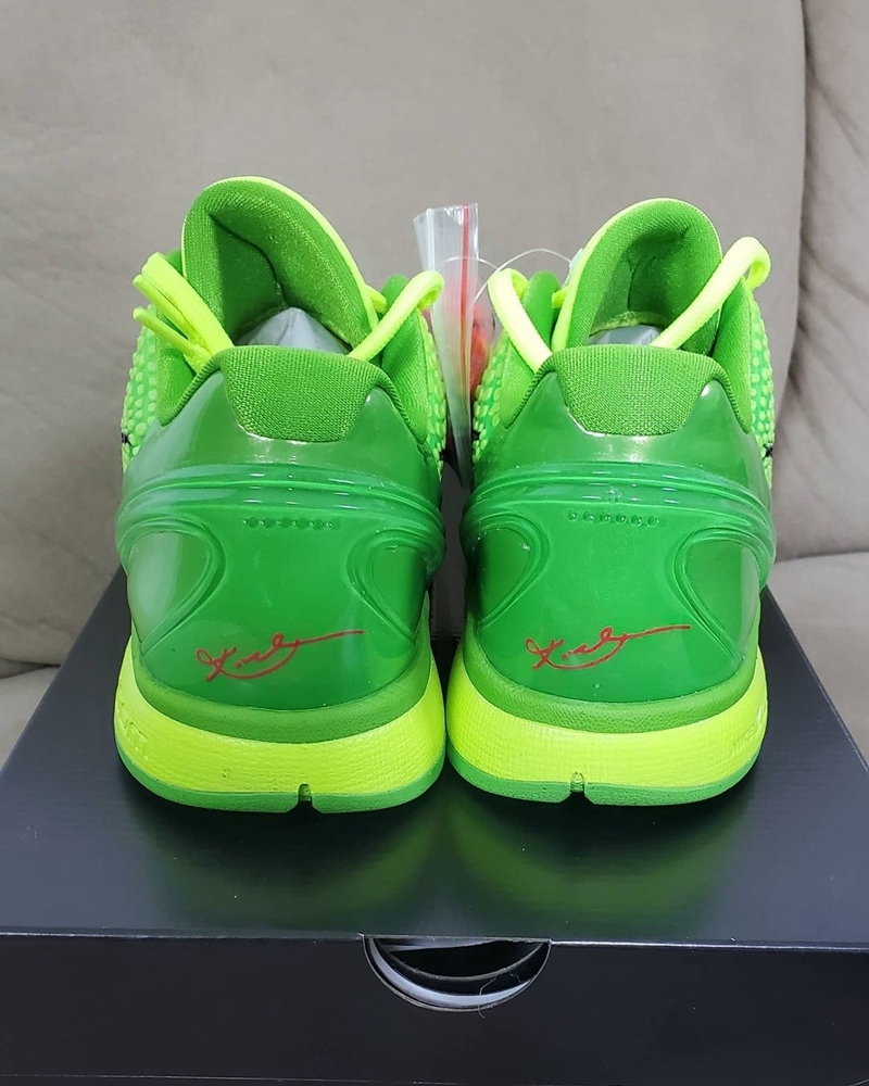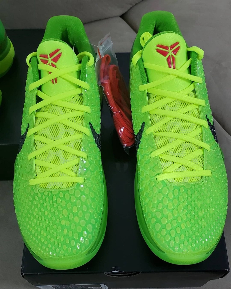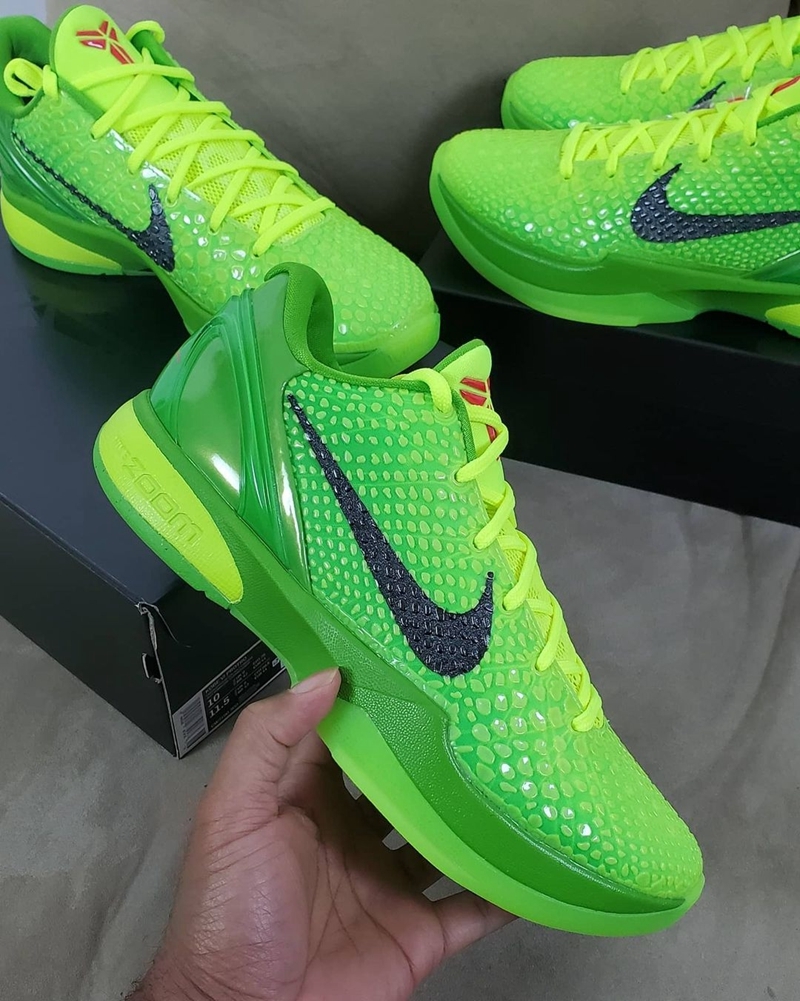 这款配色以绿色为主打,灵感来源于《圣诞怪杰》主角绿毛怪 Grinch,但鞋身立体鳞片细节,纹理精致,衬托出了曼巴的气质。