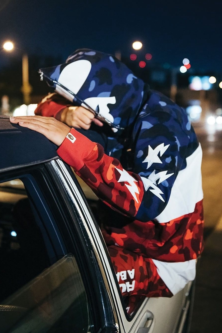 设计上BAPE 极具辨识度的 CAMO 图案注入,搭配抢眼的 Russell Athletic 最具标志性的红、白、蓝色调,将老牌美式运动风潮与象征日本前沿时尚的街头势力完美融合。