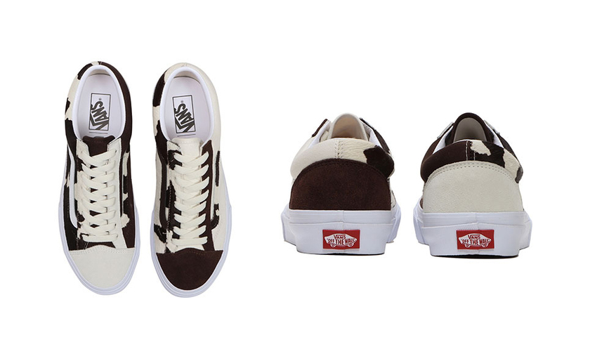 该联名鞋面采用不对称设计,以帆布和人造毛皮等材质配以黑白棕色调呈现可爱奶牛图案。