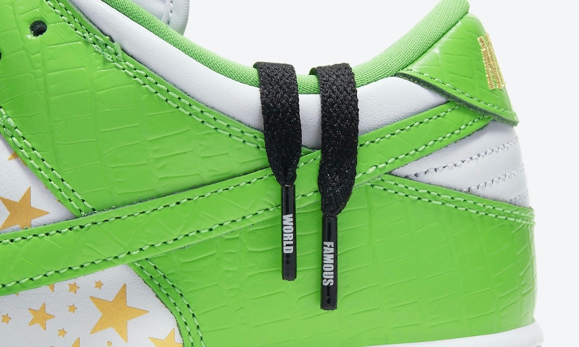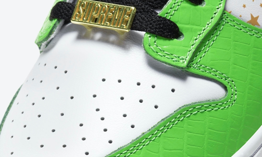 设计与蓝色版一致,绿色版鞋面采用白色皮革与绿色鳄鱼纹理皮革拼接。鞋侧金色星星印花致敬 2003 年 Supreme x Nike 经典神作 Dunk Hi 。