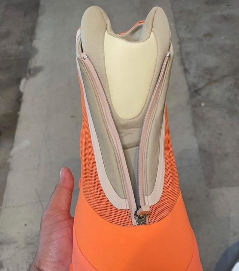 可以看到整双鞋以橙色和浅卡其色调拼接,织物、棉、TPU等多种材质复合制成的鞋面,层次丰富,时尚气质十足。加上增厚的鞋底与靴面正中拉链设计,颇有军事机能感。