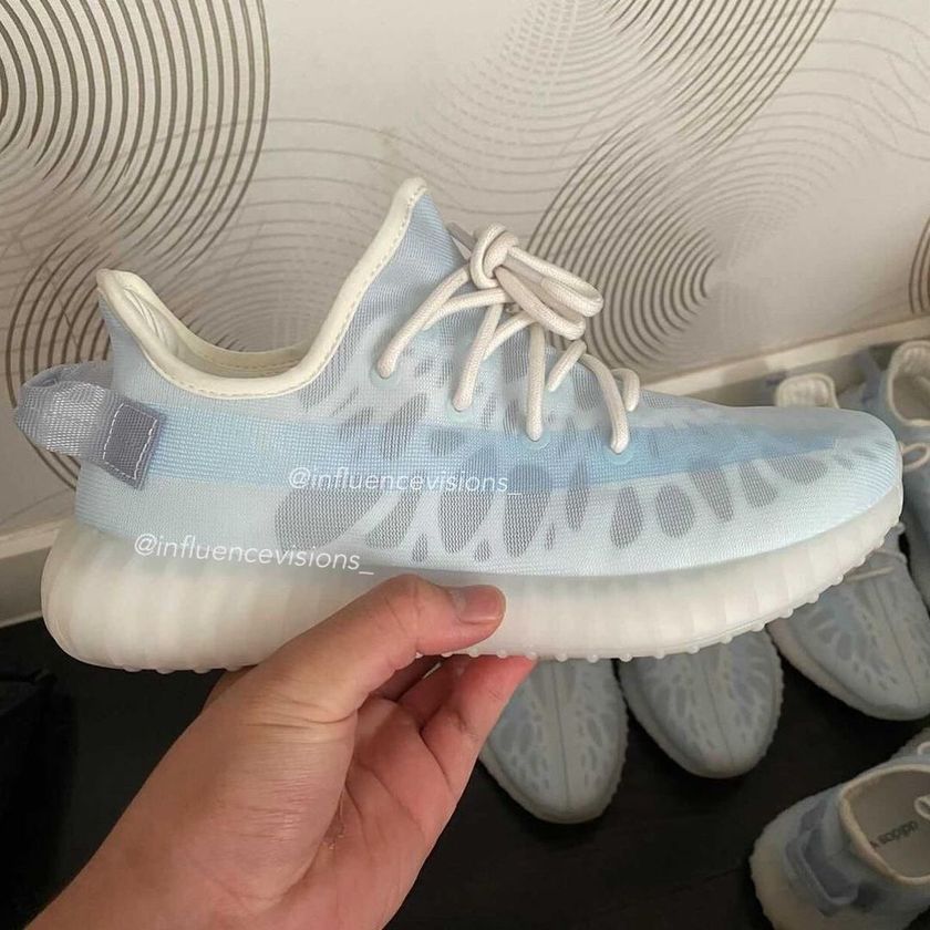 而其他两款加上此前曝光的 “Mono Ice”配色均以半透明纱线编织而成,透过鞋面可以看到内层以镂空洞洞框架呈现。