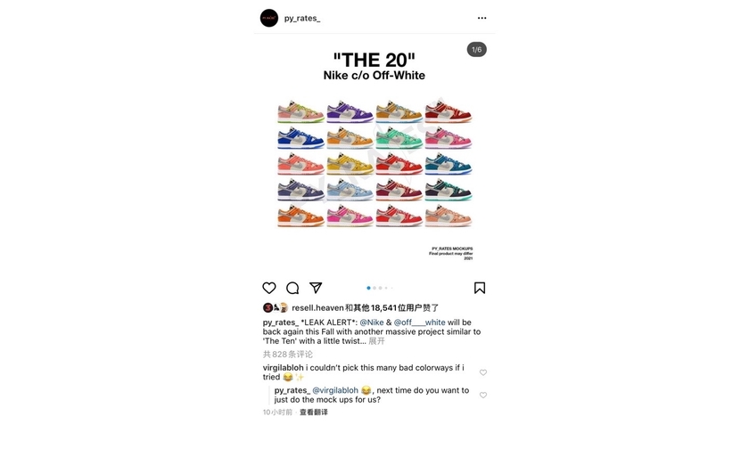继此前 Virgil 本人回复球鞋情报账号 @py_rates_ 释出的 Dunk“THE 20”系列渲染图后,近日网上又曝光了疑似 OW x Nike Dunk 系列实物图。