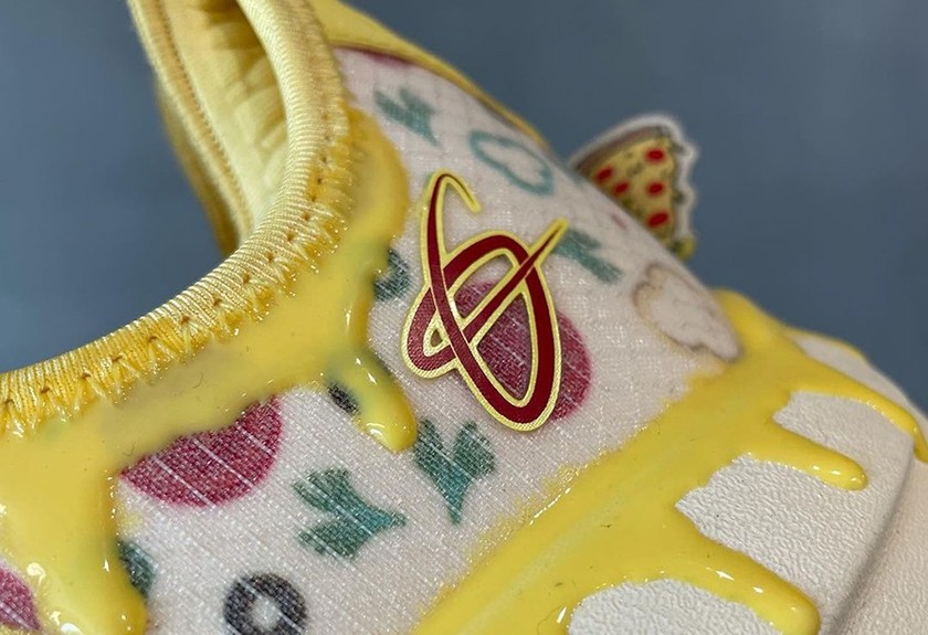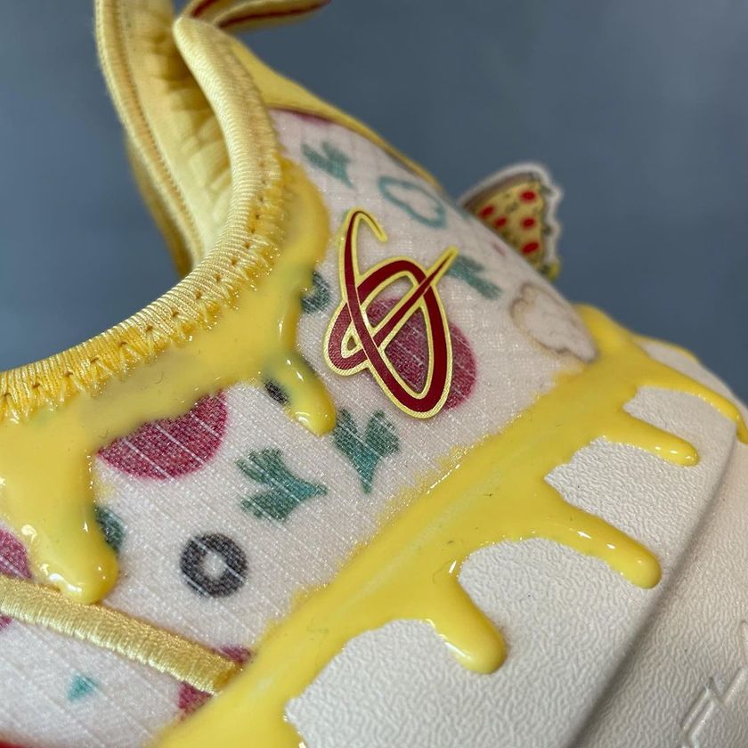 整双鞋以米黄色为基调,辅以各种黄色、红色、绿色细节点缀,加上中底处模仿芝士的细节,整体视觉冲击力极强。