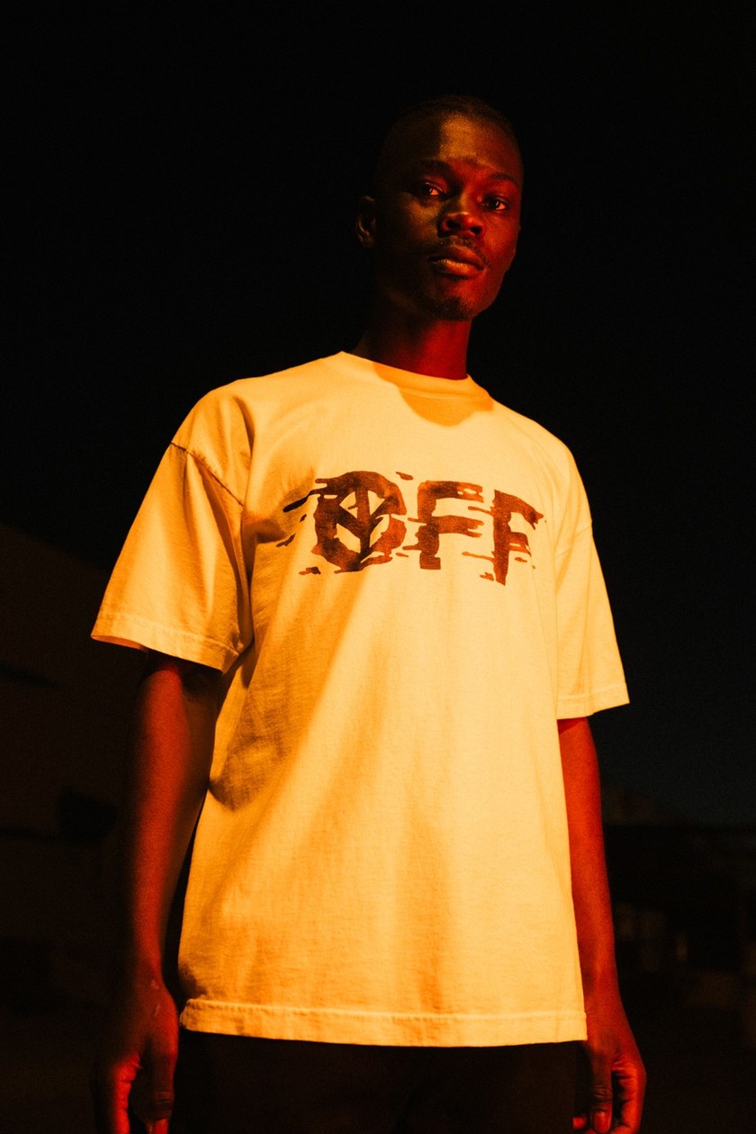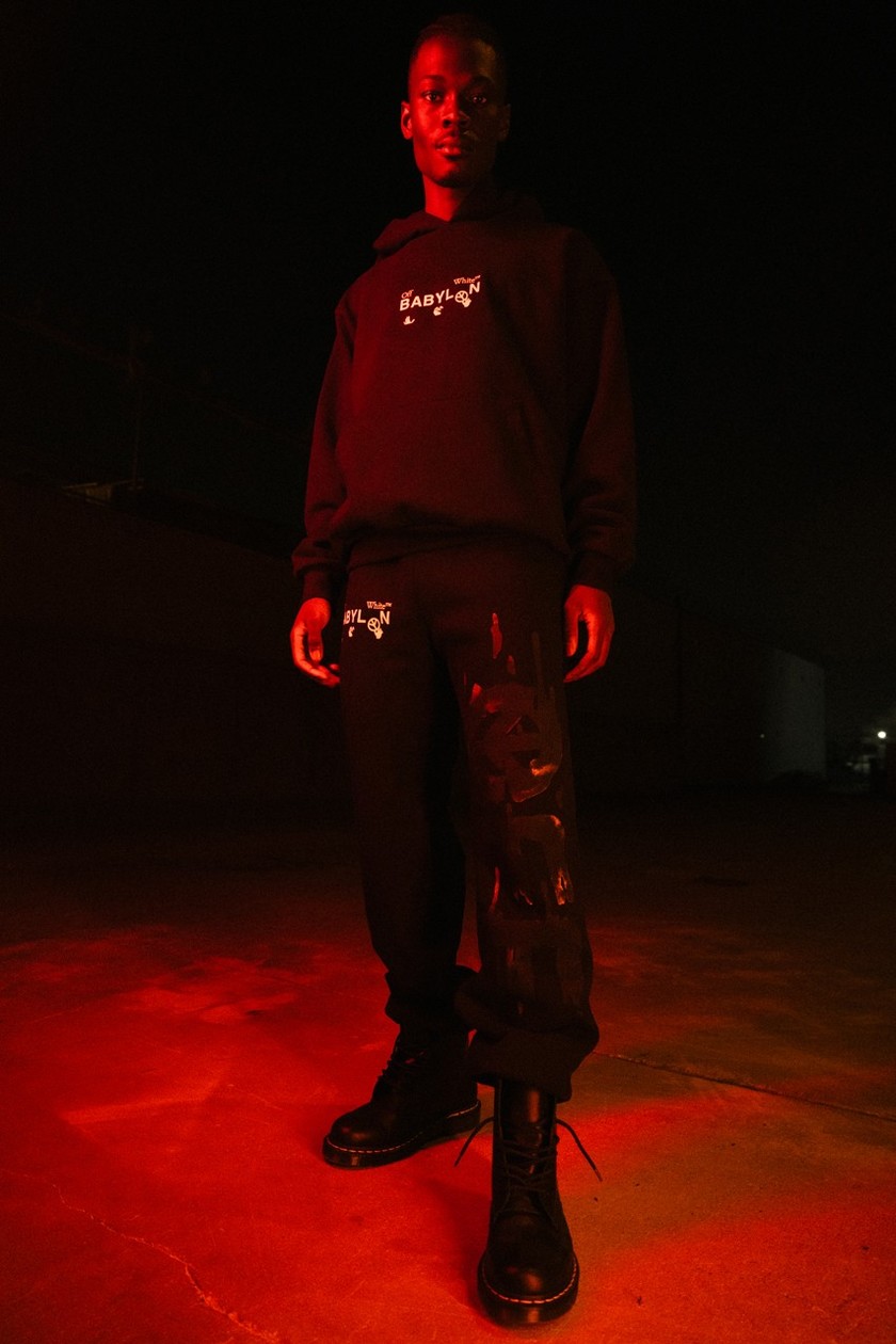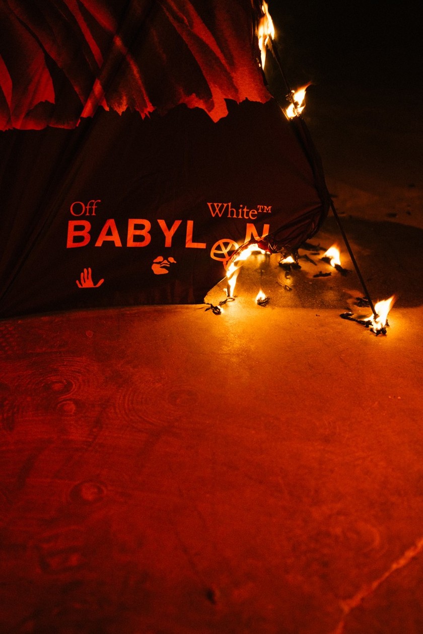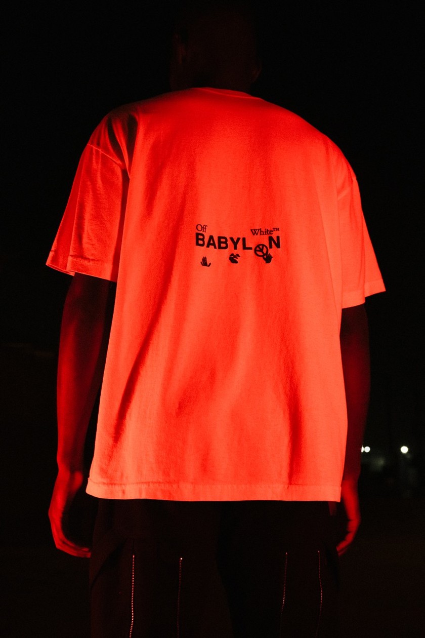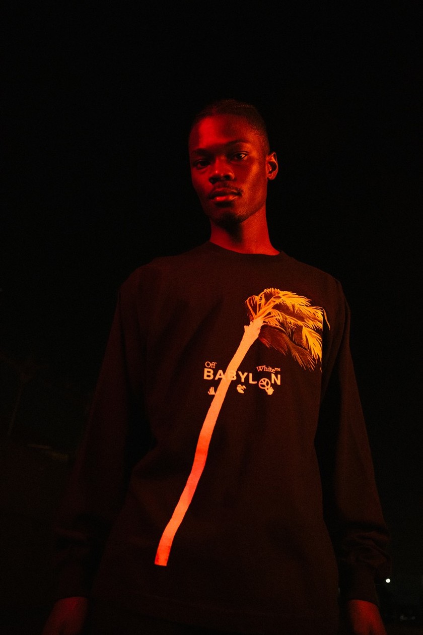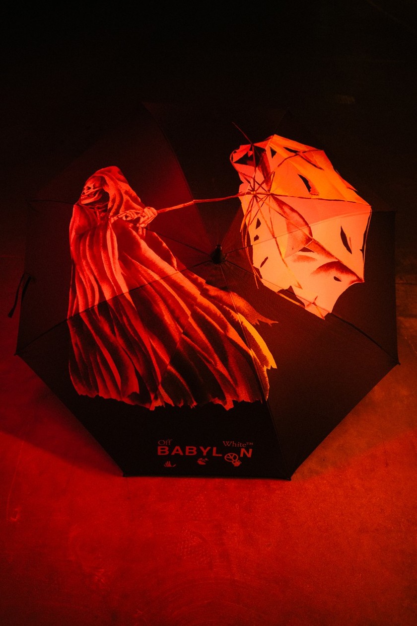 系列在设计上以 Babylon 的代表性和平图案以及 Off-White 的“OFF”品牌标志主打,并邀请了艺术家 Othelo Gervacio ,设计出被风吹拂的棕榈树和撑着伞的水彩骷髅图像,为单品设计增色。