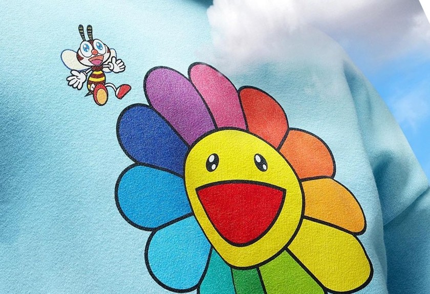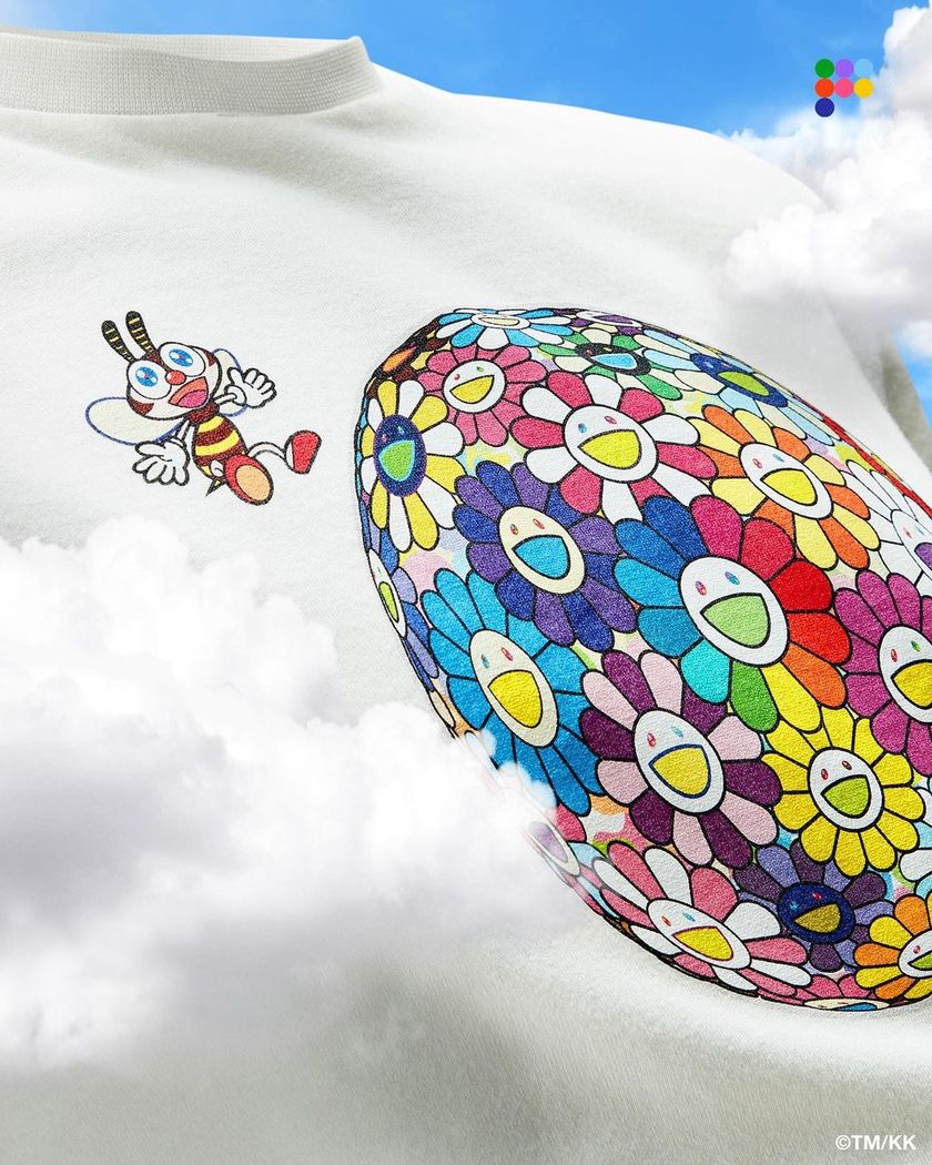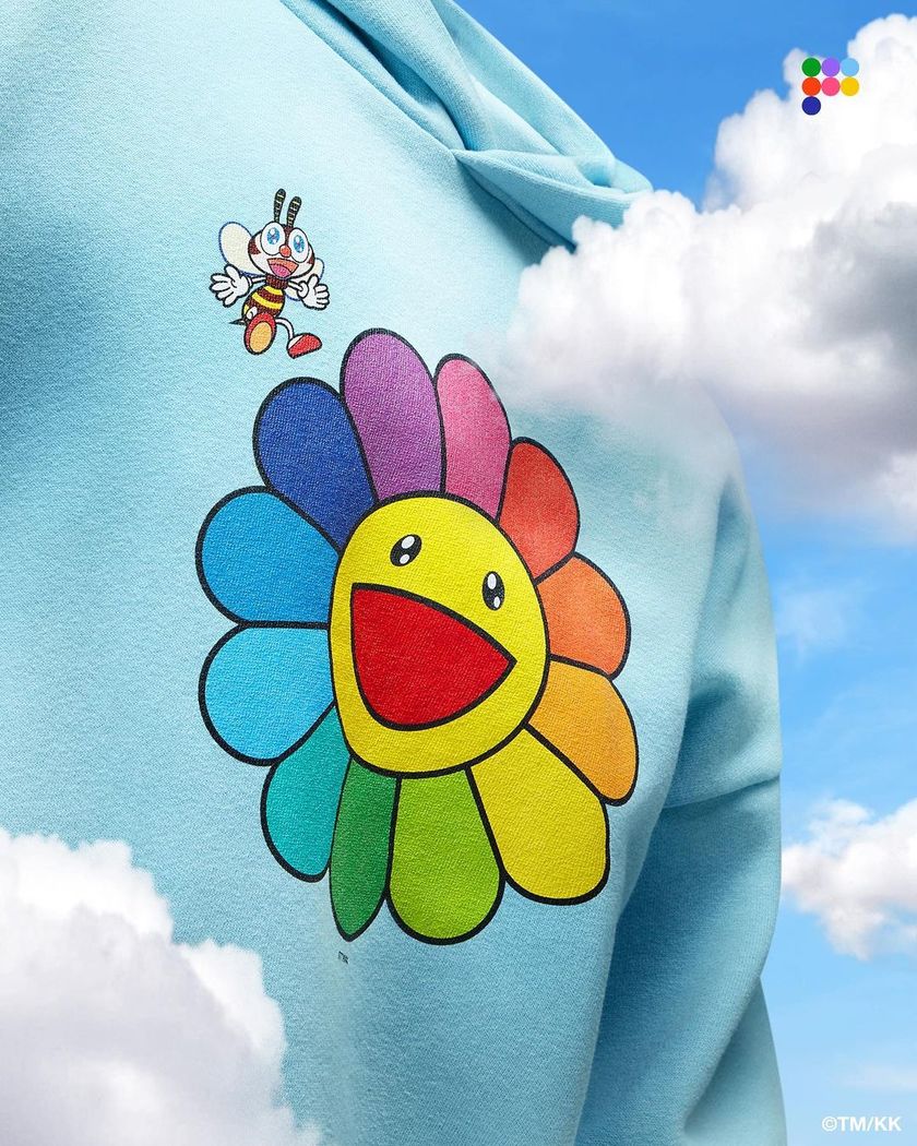 系列包括两件单品,一件 T 恤和一件蓝色帽衫,两款单品均以村上隆标志性太阳花图案主打。