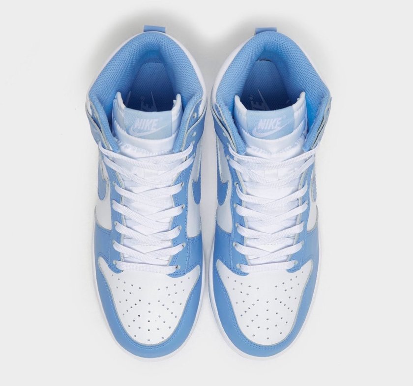 最近一款全新白蓝 Dunk High “Aluminum”在网络上曝光了实物图。可以看出该款鞋的配色与 Air Jordan 品牌旗下的北卡蓝配色几乎一致。