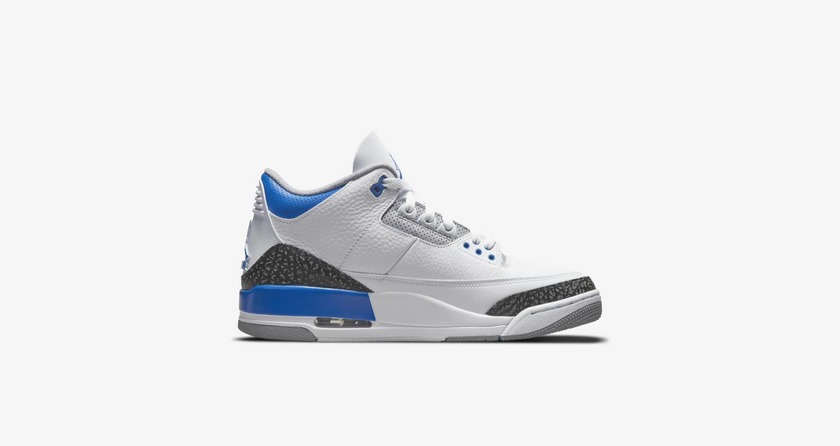 最近全新配色的 Air Jordan 3 “Racer Blue” 在网络上曝光了官图!整双鞋以白色荔枝皮为主要配色,搭配谈蓝色和标志性的爆裂纹,体现出无与伦比的高级质感。并且整双鞋的配色和藤原浩的「闪电」Air Jordan 3 非常相似。