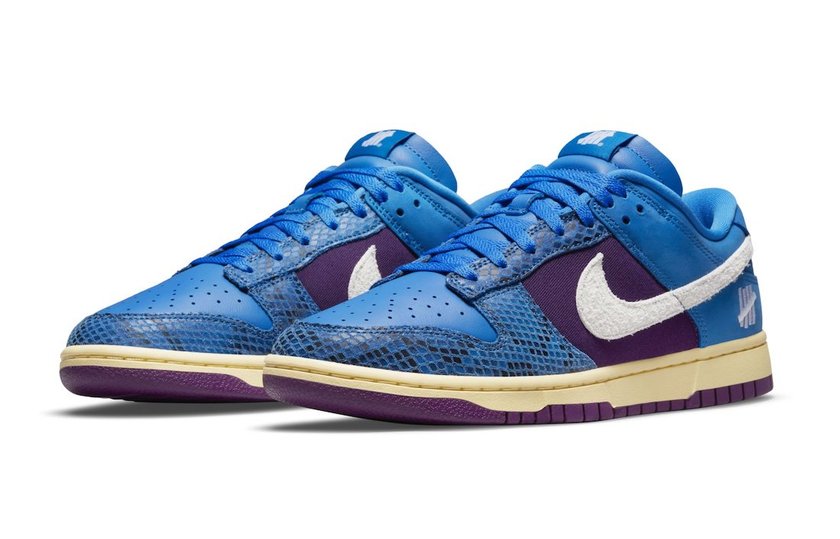 最近 UNDEFEATED x Nike 公布了一款全新的联名 Dunk Low 鞋款。整双鞋采用蓝色为主色调,鞋底和鞋身中段采用紫色搭配,醒目的 Swoosh 和 Logo 则采用白色,鞋身还有一个亮点就是鞋头及延伸段使用蛇纹皮革的材质,这些细节都彰显出这款联名鞋的高贵感。