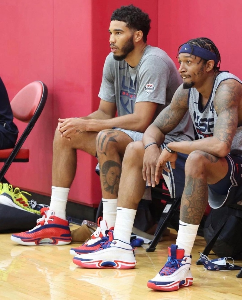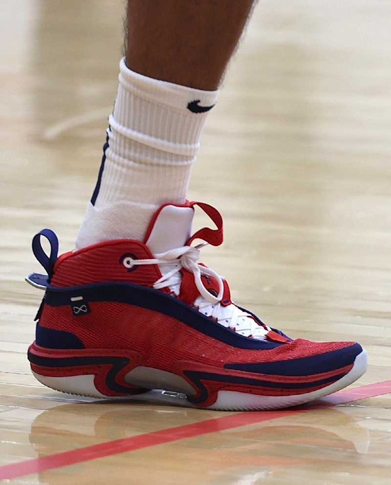 昨日美国男篮在热身赛上爆冷 87:90 输给了尼日利亚队,不过鞋头们的另一个关注点是在比赛中不少球员都上脚了全新配色的 Air Jordan 36 代。这次总共曝光了两款不同配色的 Air Jordan 36,第一双使用红色为基础,搭配上美国元素的的海军蓝和白色,层次感十足,第二双的颜色搭配则刚好与第一双相反。配置方面应该是继承之前的前后 Zoom Air 气垫 + Eclipse Plate 科技,脚感缓震方面无须担心。