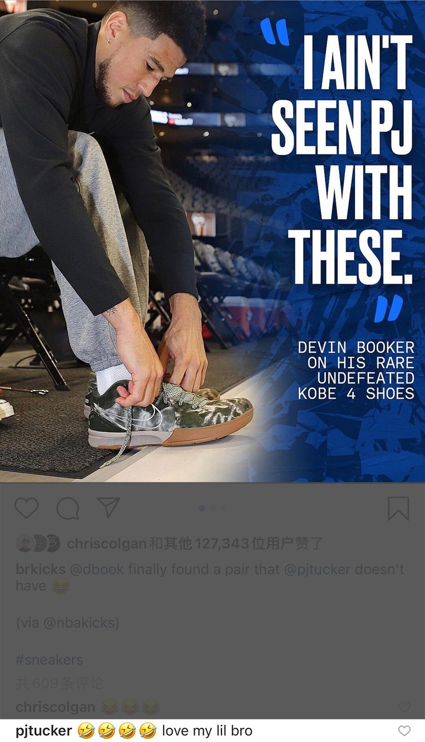 上一场鞋王 P.J.塔克入场时脚穿 Nike MAG,同时手上还提着 UNDEFEATED x Nike Zoom Kobe 4 Protro “Olive” !这让科比门徒德文·布克彻底坐不住了,晒出一款同样未市售的迷彩 UNDEFEATED x Nike Zoom Kobe 4 Protro,还在采访中说道:塔克都没有这双球鞋!之后塔克也在社交媒体上对此回应 “爱你,我的小老弟”。
