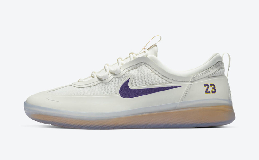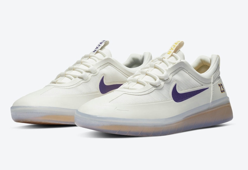 最近 Nike SB 与 NBA 再次合作公布了一双全新配色 Nike SB Nyjah Free 2 的官图。整双鞋以 Nike 签约滑板运动员 Nyjah 代言的 Nike SB Nyjah Free 2 为基础,选择大面积的白色为主调,搭配紫色 Swoosh ,细节上鞋跟绣有罗马数字 “II”,外侧的刺绣“23”标志致敬的是湖人队詹姆斯的号码。