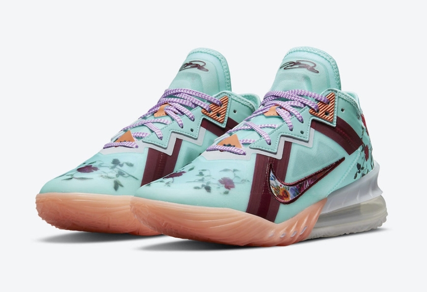 最近全新的 Nike LeBron 18 Low “Floral”在网络上曝光了官图。整个鞋身采用绿松石色搭配酒红色的设计,搭配鞋头和鞋跟花卉图案以及紫色的鞋带,视觉效果层次感十足,全掌 Zoom Air 气垫的基础上后掌还额外搭载 Max Air 气垫,缓震表现毋庸置疑。据悉这双全新的 Nike LeBron 18 Low “Floral” 会在今年年内正式发售,发售价格为 160 美元。