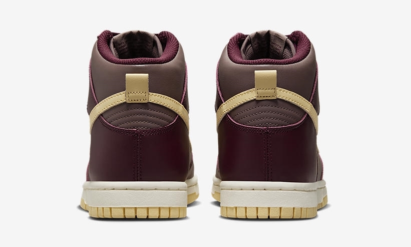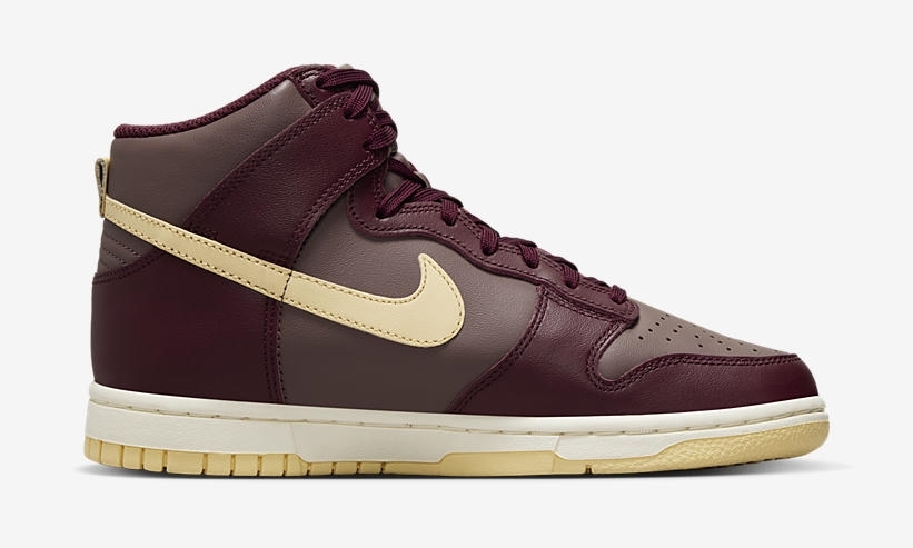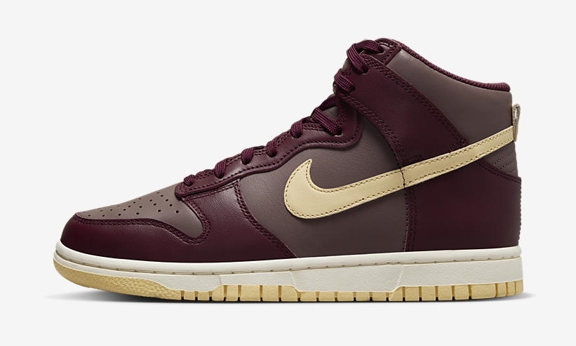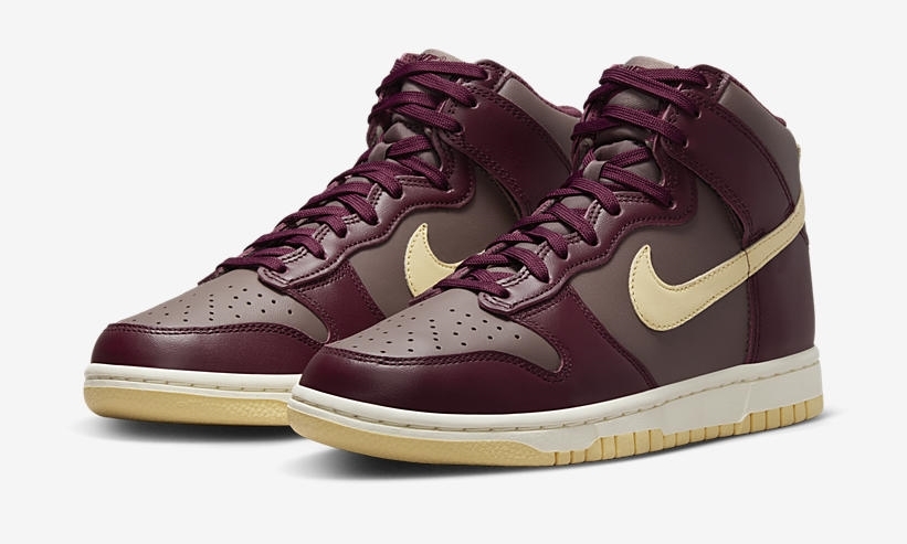 最近全新配色的 Nike Dunk High WMNS “Plum Eclipse”公布了官图。整双鞋采用酒红色妆点,米黄色点缀,鞋面采用皮革材质打造,最后白色中底搭配黄色外底收尾,视觉效果十分出众。据悉这双全新的 Nike Dunk High “Plum Eclipse” 仅为 WMNS 规格,发售价格为 125 美元。